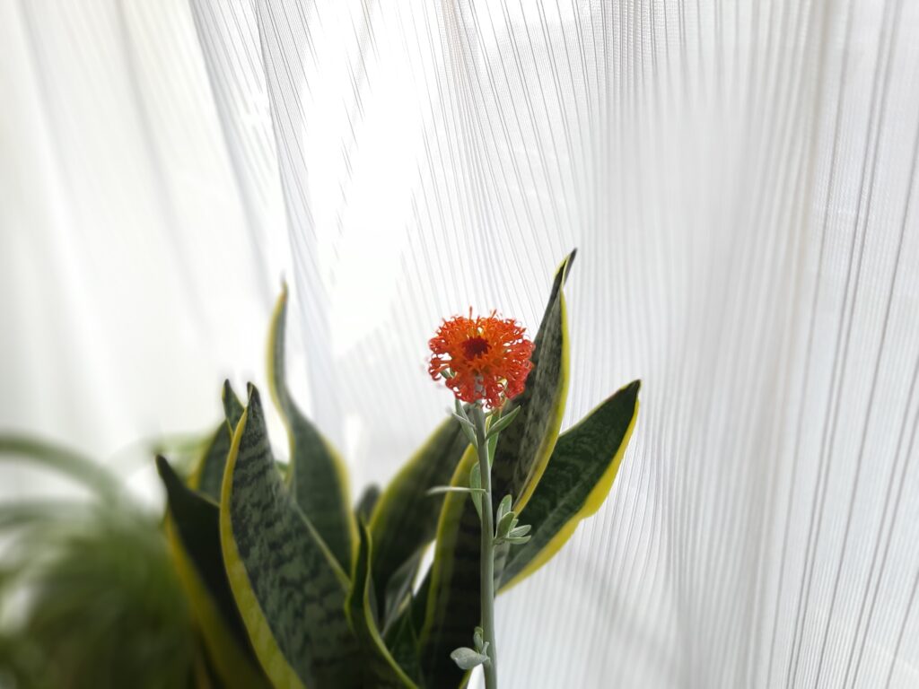 3月も半ばがすぎた。だいぶ春めいてきて、多肉っぽい植物に花がついた。いつ咲くだろうと毎日見ながら、開花までつぼみの期間が長かった。咲いてみたらオレンジの花弁で、パヤッとしてみえるよ。随分上に伸びたね。たまに珍しく咲くサボテンの花のような気分で楽しみに見守っていた。