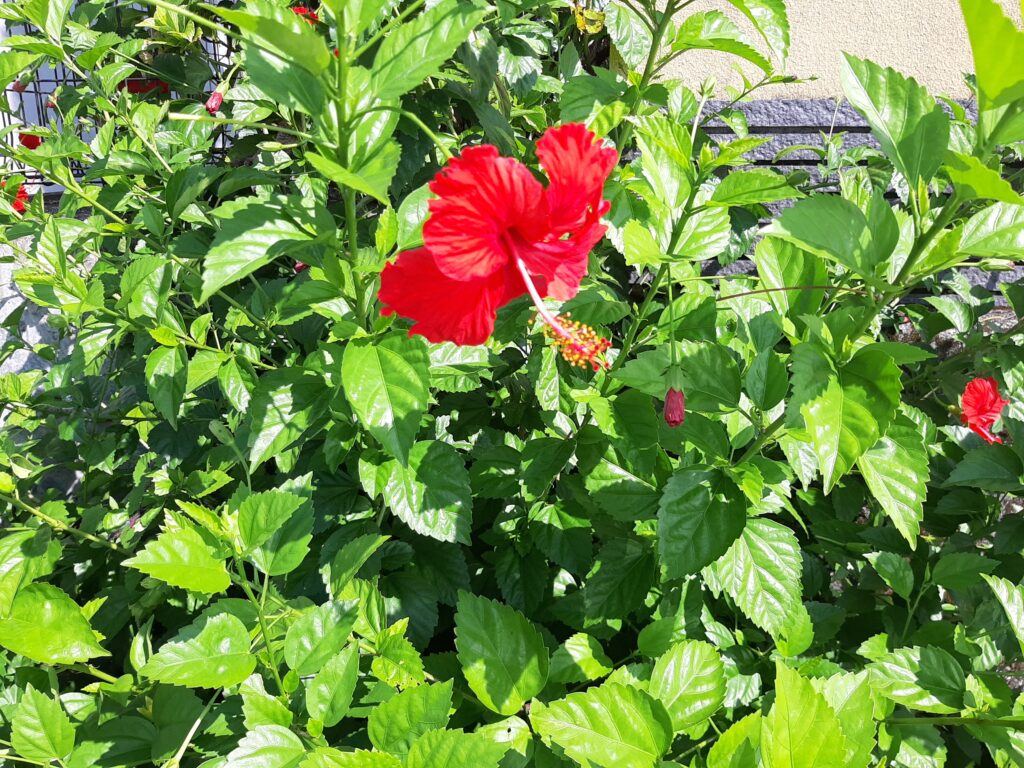 お寺からすぐ近くのカフェに行く途中を少し歩く中、ハイビスカスがきれいに咲いていた。南国の象徴のような花、立派にたくさんの花がついている。真っ赤なハイビスカスは、植えていた配置も含めてとても素敵にみえました。