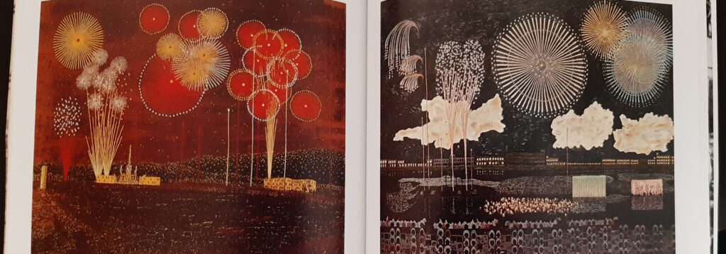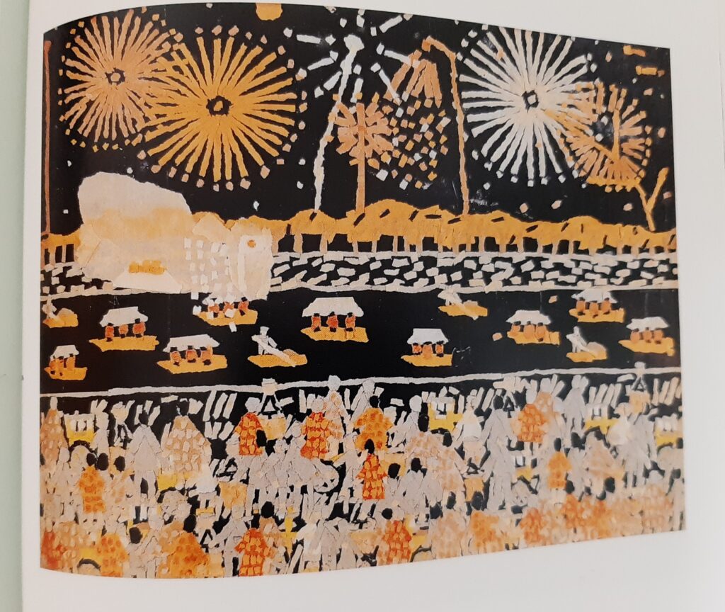 俳優が演じ、演出されたキャラクターとしての個性も際立つ山下清さんですが、本をなんとなく手に取り、そこでこの風景に惹かれました。その時の風景をこころに焼き付け、貼絵で表現されたのですね。もう75年も前の花火大会の様子ですが、このように美しく上がった花火を、その時の花火を眺める人々や大小にきれいに開く様子を今でも感じることができるようで少し嬉しい。