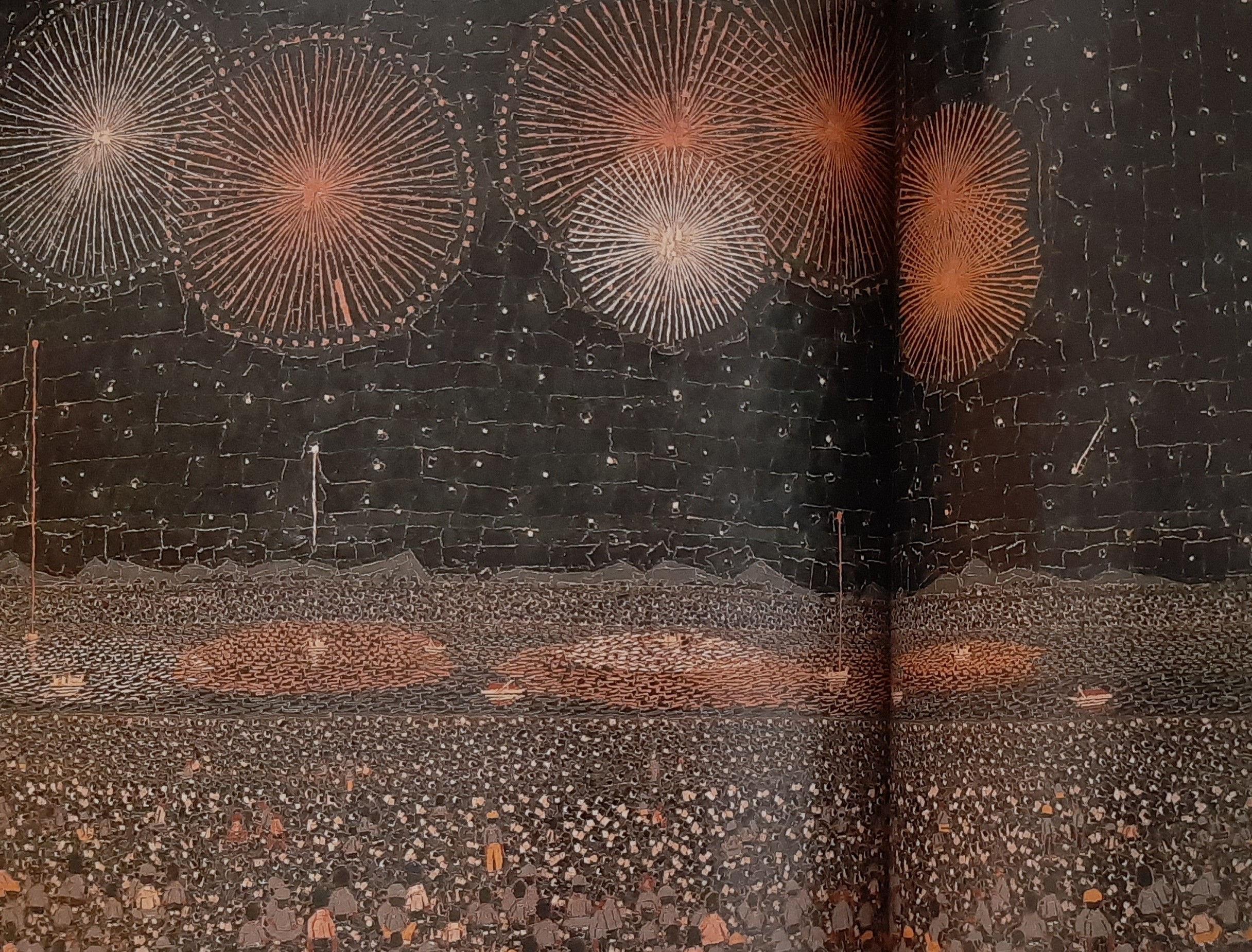 俳優が演じ、演出されたキャラクターとしての個性も際立つ山下清さんですが、本をなんとなく手に取り、そこでこの風景に惹かれました。その時の風景をこころに焼き付け、貼絵で表現されたのですね。もう75年も前の花火大会の様子ですが、このように美しく上がった花火を、その時の花火を眺める人々や大小にきれいに開く様子を今でも感じることができるようで少し嬉しい。